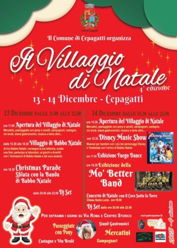Programma del villaggio di Natale: sabato 13 dicembre, ore 11:00 apertura del villaggio di Natale con mercatini, stand gastronomici, zampognari, passeggiate con pony; dalle ore 15:30 alle 19.30 arriva Babbo Natale al quale i bambini possono consegnare letterine. Alle ore 18.00 la Christmas parade con la banda di Babbo Natale per le vie del centro e del centro storico. Dalle 20.00 in poi dj set. Domenica 14 dicembre apertura del villaggio di Natale alle ore 15:00 con mercatini, passeggiate a cavallo, stand gastronomici, castagne e vin brulè. Dalle 15.30 fino alle 18.00 grande spettacolo per bambini con il musical Disney music show con i più bei personaggi Disney e la tombolata collettiva con l’arrivo di Babbo Natale! Dalle ore 18:30 esibizione della street band: Mo better band e a seguire dj set.